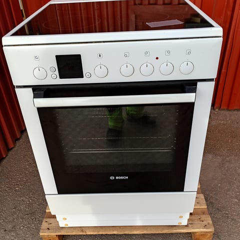 Bosch glaskeramikhäll spis i vit utförande. Spisen har glaskeramisk häll med flera kokzoner och ugn med flera inskjutningsnivåer. Ugnsutrymmet är utrustat med ugnsgaller och plåtar enligt bilder. Fronten har vred för inställning av värme på häll och ugn. Passar för normal köksanvändning där man önskar en fristående spis med glaskeramikhäll och inbyggd ugn.