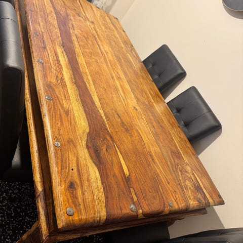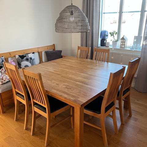 Matbord massiv björk 220 cm långt med iläggs skivan 266 cm bredd 100 cm. Överdraget på stolarna behöver bytas finns på IKEA.