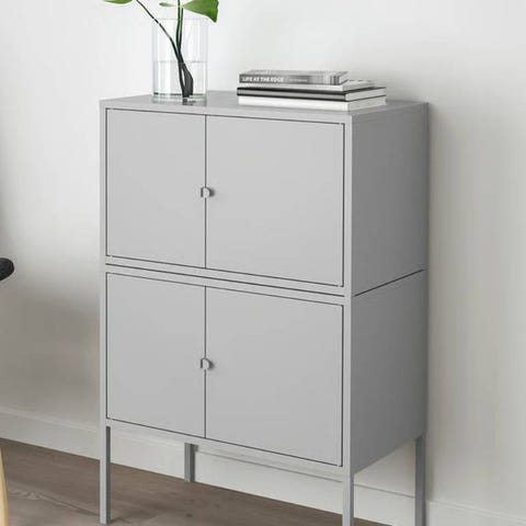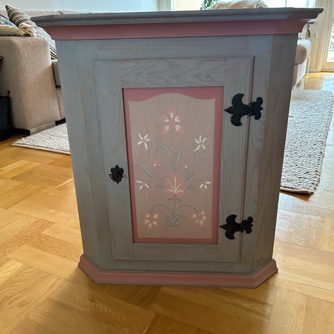 Aprikosfärgat hörnskåp med två hyllplan. Man kan ta av benen ifall man vill hänga det på väggen. Står inpackat sedan en flytt, därför har jag inga egna bilder.