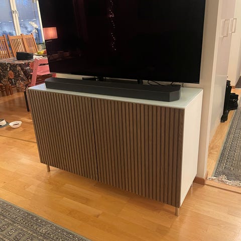 Hylla TV bänk Mediaförvaring Sideboard IKEA Bestå med luckor, hylla och utan ben. Spår av användning finns.