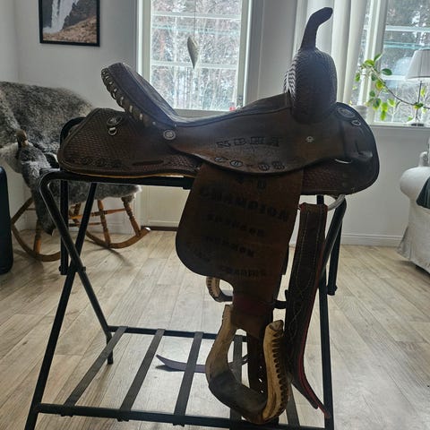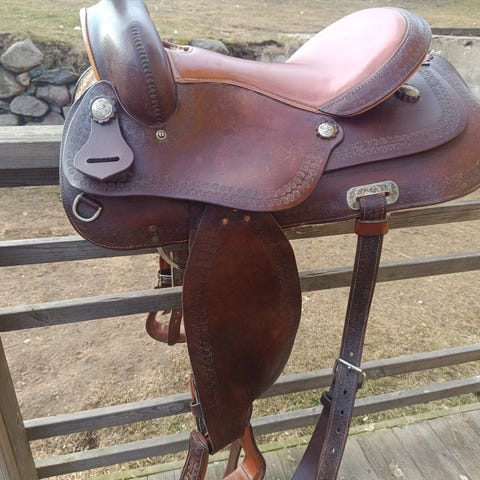 Säljer en fin westernsadel från Rocking R Saddlery. En klassisk Pleasure/Show-modell med vacker tooling och silverdetaljer.