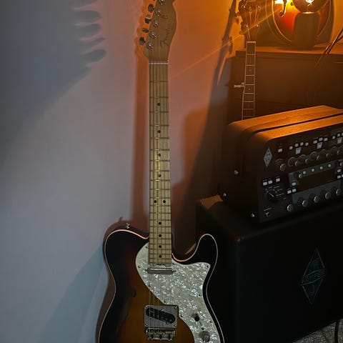 Fender Telecaster Thinline elgitarr i sunburst-finish. Semi-hollow-kropp med f-hål, Telecaster-hals i lönn. Med bigsby.