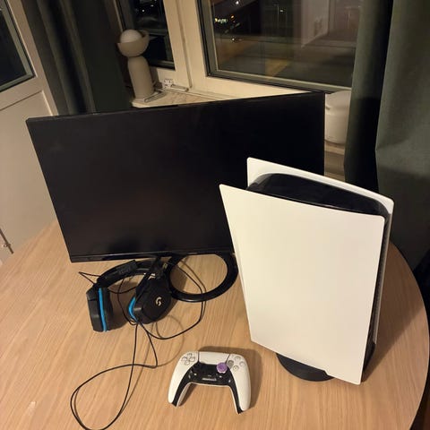 Sony Playstation 5 spelkonsol i vit färg. Konsolen är avsedd för TV-spel och stödjer moderna spel med hög upplösning. Kontroller visas på bild tillsammans med konsolen och TV-skärm med spelmeny. Lämplig för användning i hemmet för olika typer av spel och underhållning. Finns i Stockholm