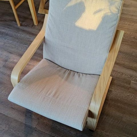 Seniorfåtölj i ljust beige och ljustträ med justerbar rygg i bra skick.Inköpt på EM möbler