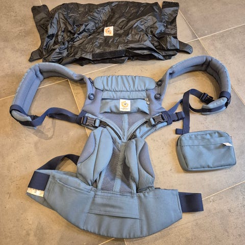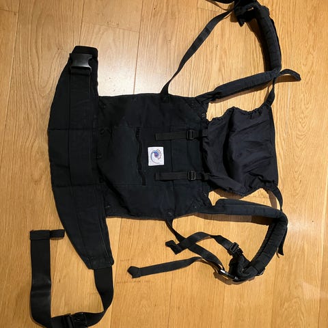 Ergobaby bärsele med tillhörande spädbarnsinlägg. Bärselen är i svart tyg med beige huva och justerbara axelremmar och midjebälte. Spädbarnsinlägget är i beige vadderat tyg och ger extra stöd för mindre barn. Produkten är avsedd för att bära barn nära kroppen och fördela vikten över axlar och höfter. Passar för vardagsanvändning både inomhus och utomhus.