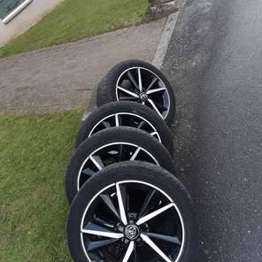 Toyota lättmetallfälgar med monterade däck i dimensionen 225/45 R17. Fälgarna är femekrade aluminiumfälgar med bultcirkel anpassad för Toyota-personbil. Däckens dimension 225/45 R17 framgår av märkningen på däcksidan. Produkten består av kompletta hjul, det vill säga däck monterade på fälg, klara för montering på bil där dimension och bultmönster passar.