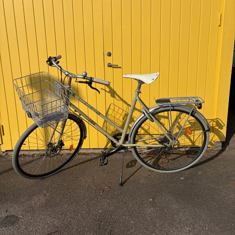 Skeppshult herrcykel med 28" hjul och fem växlar. Cykeln har blå ram med ljusa däck, raka styre och fotbroms bak. Utrustad med skärmar, pakethållare bak, kedjeskydd, reflexer och stöd. Passar för vardagscykling och pendling för vuxen man eller längre person som trivs med upprätt sittställning. Nyservad Sparsamt använd.