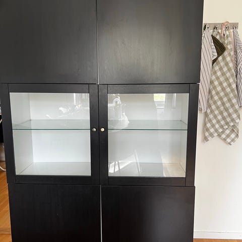 IKEA skåp Bestå Tofta, blank svart front med en skiva plexiglas i vardera dörr. I bra skick och utan repor eller märken.