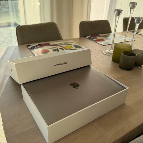 Apple MacBook Air M1 2020 laptop med Apple M1‑chip och 8 GB RAM. Enheten kör macOS Sonoma 14.3 enligt visad systeminformation. Lämplig för vardagligt arbete, studier och medieanvändning. Knappt använd.