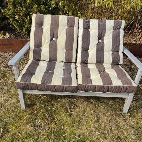 IKEA Önnestad fåtölj med klädsel i vit/grön randigt tyg. Stomme i grönt metallrör med låg, lutande sittställning. Sitt- och ryggdyna är lösa och klädda i samma randiga tyg. Se sista bild för mått. Använd sparsamt under en sommar.