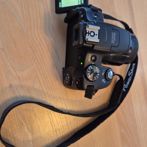 Canon PowerShot A460 digitalkamera i silverfärg. Kompaktkamera med inbyggd zoomoptik och inbyggd blixt. Kameran har LCD-skärm på baksidan för bildvisning och menyinställningar samt flera funktionsknappar och programvalshjul för olika fotolägen. Utrustad med handledsrem för säkrare grepp och hantering.