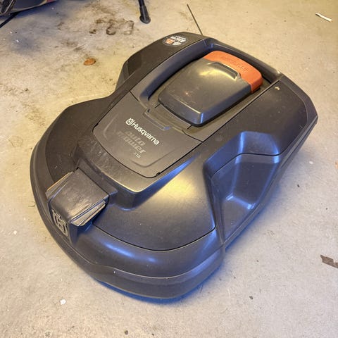 Husqvarna Automower robotgräsklippare. Modellen är avsedd för automatiserad klippning av gräsmatta inom ett avgränsat område med hjälp av begränsningskabel. På bilderna syns robotgräsklipparen, laddstation/transformator samt en installationssats med bland annat kabel, märlor och skarvdon. Utrustningen är lämplig för installation i trädgård där man vill ha regelbunden, automatisk klippning av gräsmattan. Exakta tekniska data som klippyta, batterikapacitet och modellbeteckning framgår inte tydligt av underlaget och bör kontrolleras av köparen vid behov.