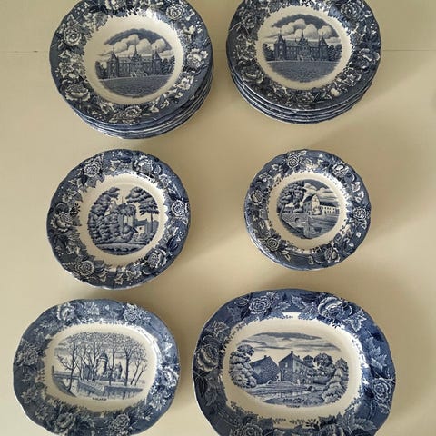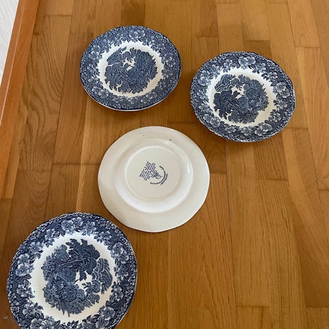 Säljer matservice från Bengali Rörstrand. Vit botten med blå dekor.