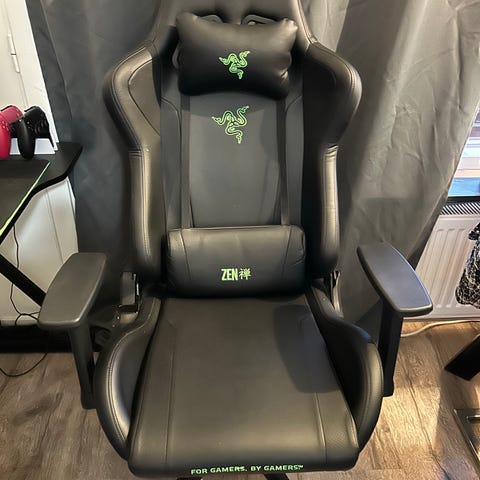 Razer gamingstol i svart konstläder. Stolen har hög rygg med integrerat nackstöd och sidostöd, samt justerbara armstöd. Sitsen är stoppad och klädd i konstläder med Razer-logotyp och text på framsidan. Stolen är höjdjusterbar och har lutningsfunktion med låsning. Fotkrysset är utrustat med hjul för enkel förflyttning. Passar för användning vid skrivbord och gamingstationer.
