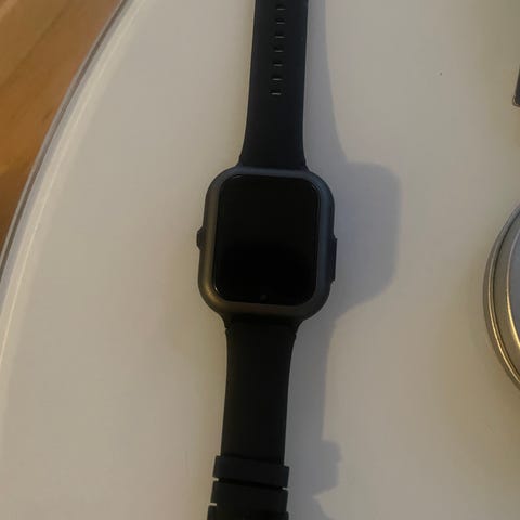 Smart klocka i svart färg med rektangulär urtavla och svart armband. Perfekt för träningen/Yoga