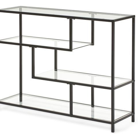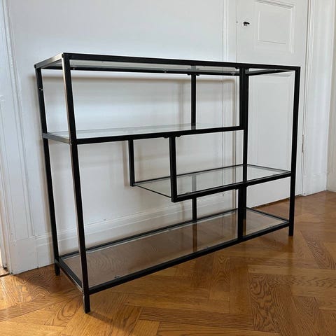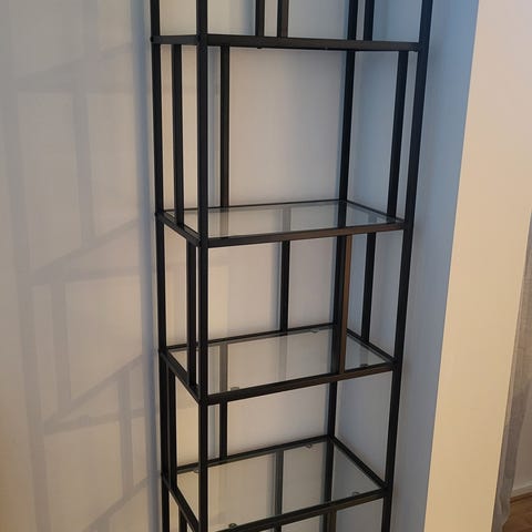 Hylla i svartlackerad metall. Hyllplan av glas.
