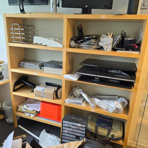 Hyllsystem i trä med flera hyllplan. Gavlarna har förborrade hål som gör att hyllplanen kan justeras i höjd med hjälp av metallkonsoler. Hyllan är fristående och lämpar sig för förvaring i förråd, kontor eller liknande utrymmen. Träytan är lackad och visar vissa spår av användning.