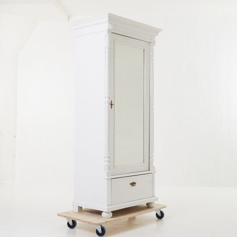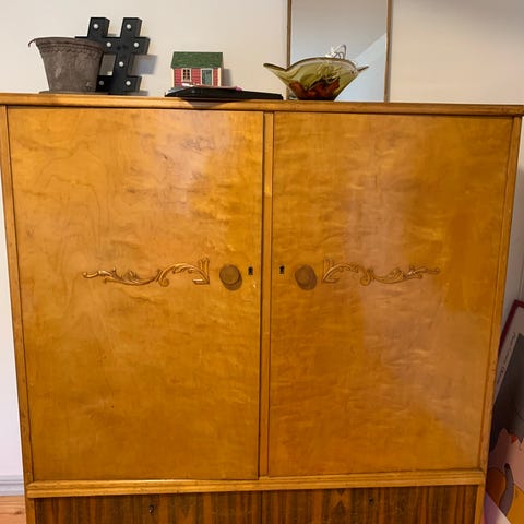 Vackert skåp i barockstil, tidigt 1900-tal, tvådelat, 6 hyllplan som går att ändra läge på, ek. senare bemålat, draghandtag i smide. Tung och "ordentligt".