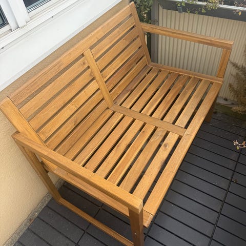 Utemöbler i trä, något slitna av väder och vind men är stadiga och i bra skick. Består av 4 delar som kan sättas ihop i olika konstellationer.