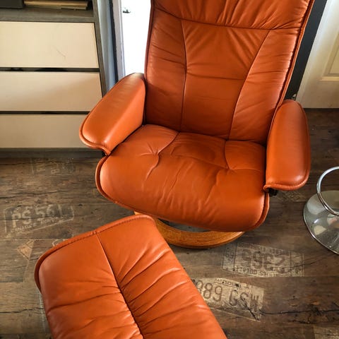 2 fåtöljer med tillhörande fotpallar i grått skinn. Fåtöljerna har stoppade armstöd och sits, fotpallen är klädd i samma material och färg som fåtöljerna. Underredet på fåtöljen är i trä med rund fot. Passar som sittmöbel i vardagsrum, läshörna eller liknande utrymme där man önskar en bekväm sittplats med möjlighet att vila benen på fotpallen.