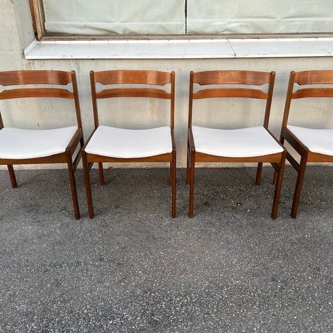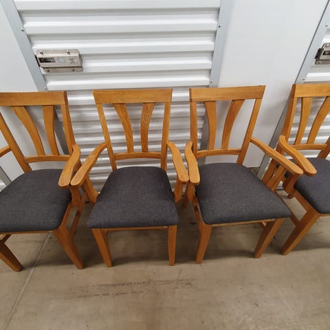 Stolarna är i ett ljust träslag med vadderade och klädda ryggar och sitsar. De har varit mycket bekväma, men är nu i behov av lite fix och kärlek, därav det låga priset.