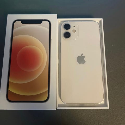 Apple iPhone 12 smartphone med 64 GB intern lagring. Modellen har en vit baksida och platt skärm med tunn ram. Utrustad med dubbla kameror på baksidan och frontkamera i skärmens ovankant. Levereras i originalförpackning enligt bilder. Lämplig för vardaglig användning som samtal, meddelanden, surf, appar och mediauppspelning.