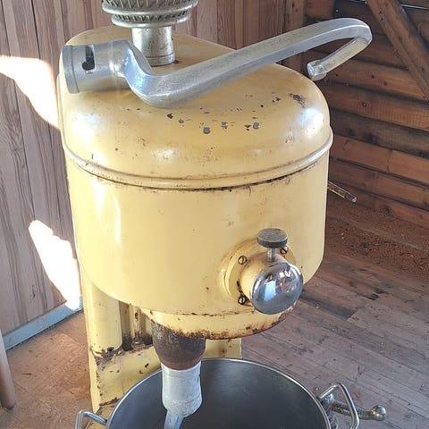 Rostfri deg maskin på hjul. Maskinen är tillverkad i metall med rostfri yta och har ett matningsfack upptill samt utlopp framtill. Den är utrustad med elkabel med stickkontakt och har hjul undertill för enklare förflyttning. Avsedd för bearbetning av deg eller liknande råvaror i köks- eller restaurangmiljö.