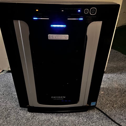 Electrolux Z9124 luftrenare i svart utförande. Modellen drivs med 220–240 V, 50/60 Hz och har en effekt på 70 W. På ovansidan finns kontrollpanel med knappar för olika fläkthastigheter och funktioner. Avsedd för inomhusbruk för att filtrera och rena luften i rummet.