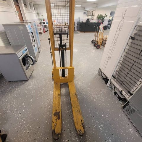 Pallyftare handtruck med manuell lyftfunktion. Maximal lyftkapacitet är 2000 kg enligt märkning på gaffeln. Utrustad med två gafflar och styrhandtag med pumpfunktion. Färg gul med svart handtag. Avsedd för hantering och förflyttning av lastpallar i lager, verkstad eller liknande miljöer.