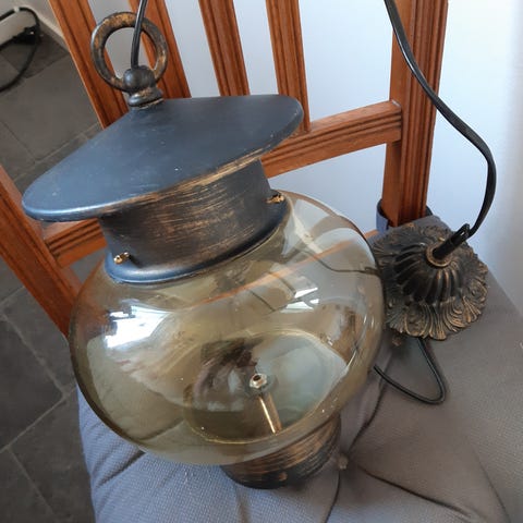 Säljer nu min retrolampa känd för sin Kopparbur och bubbliga bärnstensfärgade glas