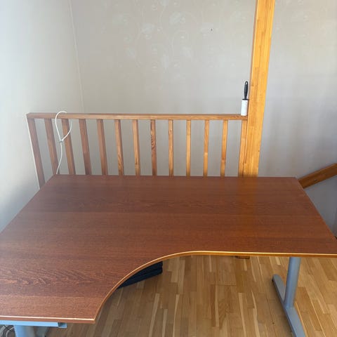 Säljer ett rymligt och stabilt L-format hörn-/arbetsbord i fint skick. Perfekt för hemmakontor, gaminghörna eller kreativa projekt. Bordsskivan är i ljus träfinish och benen i robust metall.
