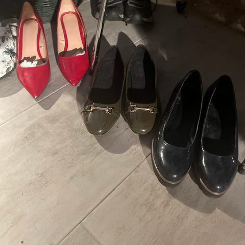 Skorna har låg klack och fyrkantig tåform.