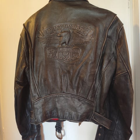 Harley-Davidson jacka för herr i storlek M. Svart läder med broderad Harley-Davidson-logotyp och text på ryggen samt mindre märke framtill. Klassisk modell med krage, dragkedja framtill och flera fickor. Passar som motorcykel- eller vardagsjacka beroende på behov. Köp i början av 2000-talet och använda ett fåtal gånger.