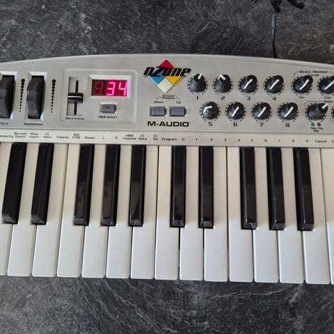 32 anslagskänsliga tangenter i vitt och svart. Hölje i grå plast. Utrustad med enkla kontrollknappar och ratt för styrning av funktioner i musikprogram. Ansluts via USB-kabel till dator eller annan kompatibel enhet för styrning av mjukvaruinstrument och inspelning. Lämplig för musikproduktion, övning och enklare inspelningar i hemmastudio eller mobil setup.