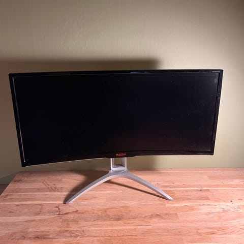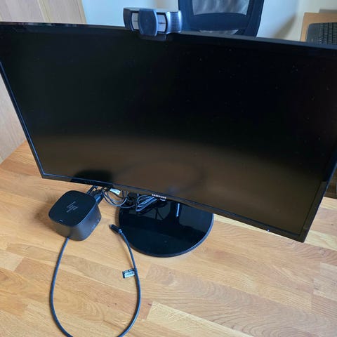 Skärm på 34 tum med böjd, ultrabred bildyta. Passar för användning med dator, exempelvis för arbete, spel eller film. Skärmen har inbyggda USB-portar på sidan för anslutning av tillbehör. Monterad på höj- och lutningsbart stativ