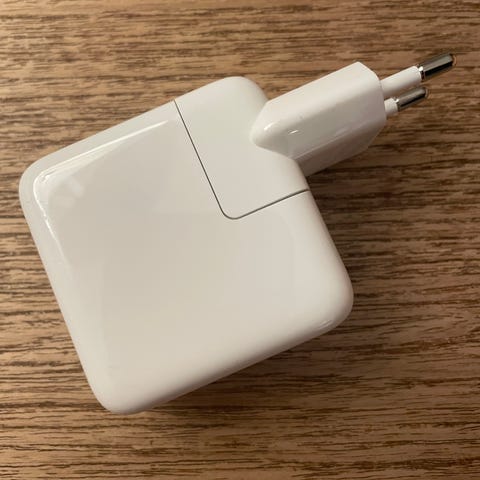Apple 61W USB‑C nätadapter i vit plast. Modellen är märkt "61W USB‑C Power Adapter" och har en USB‑C‑port för anslutning av laddkabel. Adaptern är avsedd för användning med IT‑utrustning som stöder USB‑C‑laddning. Europeisk stickpropp för vägguttag ingår i den integrerade kontaktdelen.