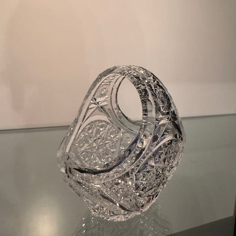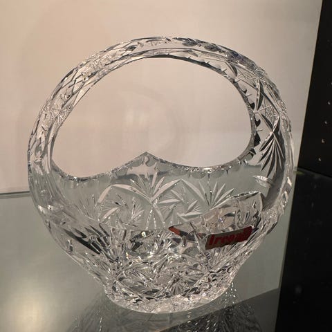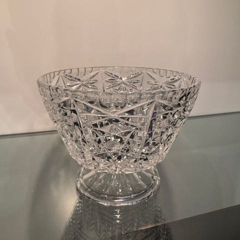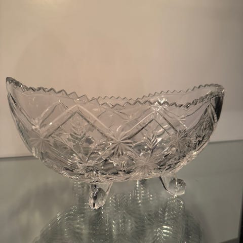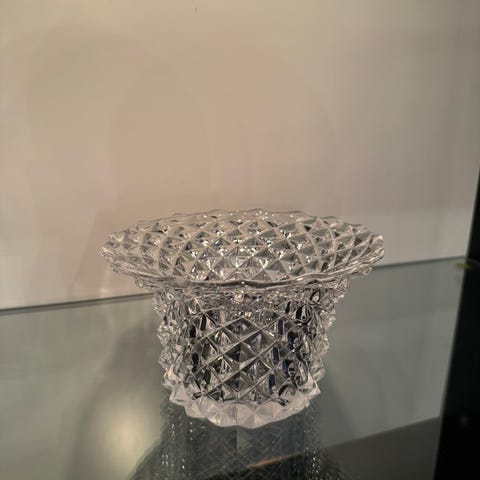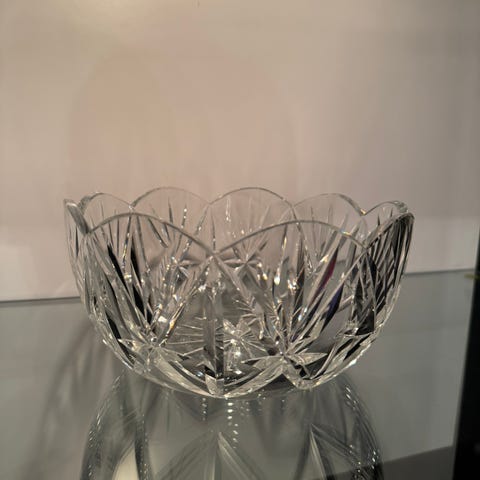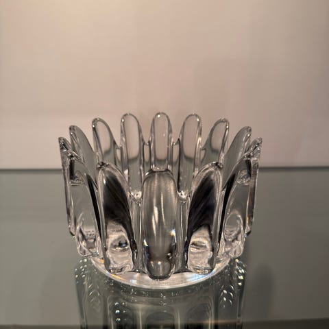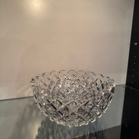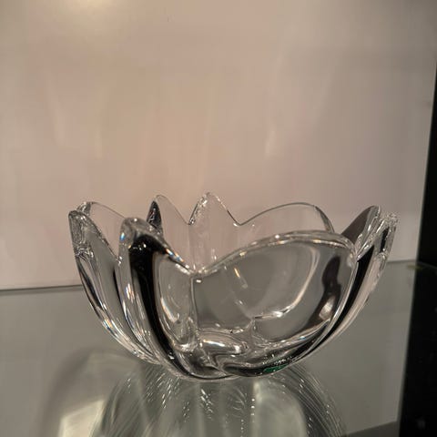 Skål i klart glas med vågig, snirklad form. Diametern är cirka 20 cm och höjden cirka 8–9 cm enligt måttbandet på bilderna. Passar till servering av frukt, godis eller som dekoration.