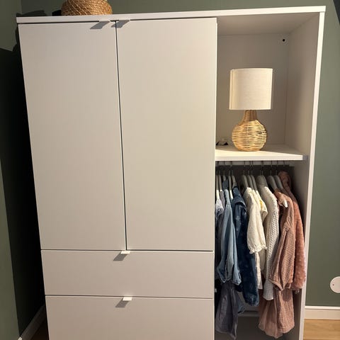 Vit förvaringsgarderob med hyllor och lådor