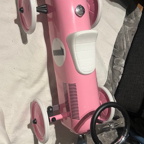 Blå trampbil i plast med fyra hjul och ratt. Bilen har pedaler för framdrivning och är avsedd som leksaksfordon för barn att köra utomhus på exempelvis gräsmatta eller uppfart. Enkel konstruktion med låg sittposition och breda däck för stabilitet.