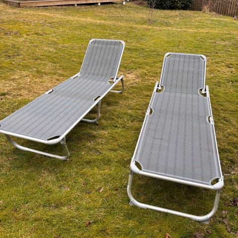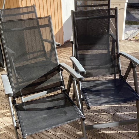 Sparsamt använda, stått ute. Grå /vita. Ingår bordet som är med på bilden, bordet har glaskiva.