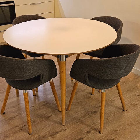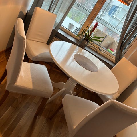 Runt matbord med vit bordsskiva och matchande ben i MDF. Bordet är lackerat för utökad hăllbarhet. Ø110 xH75 cm nytt pris 1999 kr