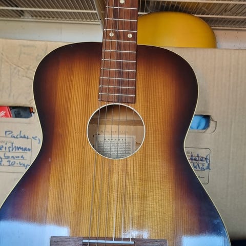 Levin akustisk gitarr i mindre kroppsstorlek. Gitarren har sex strängar, (en saknas). fast stall i trä och mekanik med öppna stämskruvar. Greppbräda i mörkt trä med positionsmarkeringar.