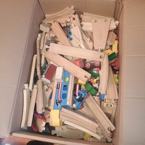 BRIO trätågset med blandade delar. Innehåller rälsdelar i trä, och flera olika fordon såsom tåg, vagnar och i olika färger samt batteridrivet tåg. Levereras samlat i en plastlåda enligt bild.