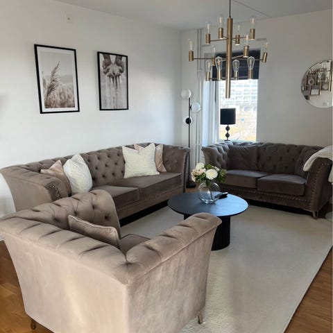 Jätte fin soffa från Mio Harper. Säljes pågrund flytt. 8500kr vill man med två fåtölj och grönt pall 10000kr