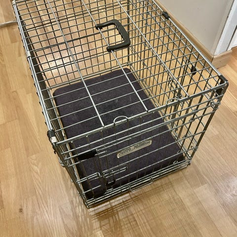 Hundbur lutande, mått Bredd 57, längd 90, Höjd 64 och djup 54,5. Knappt använd