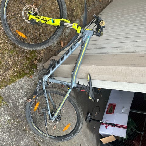 Scott Voltage barncykel med 26" hjul. Cykeln har en grön ram med dämpad framgaffel och grovmönstrade däck anpassade för cykling på både grus och enklare skogsstigar. Utrustad med handbromsar fram och bak samt växlar med reglage på styret. Passar äldre barn eller ungdomar som behöver en något större barncykel med sportig utformning. Den har punktering eller bara ingen luft i hjulen.