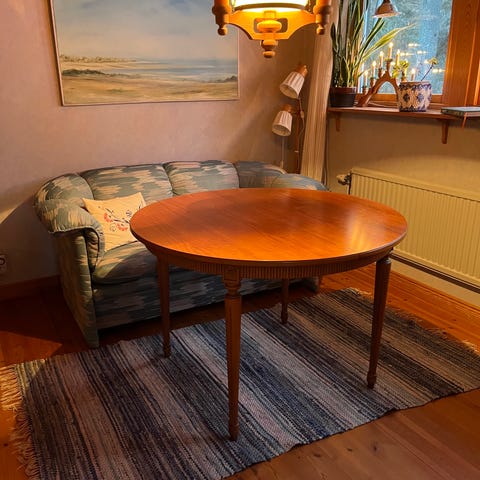 Matbord med 4 + 4 stolar samt två iläggsskivor.