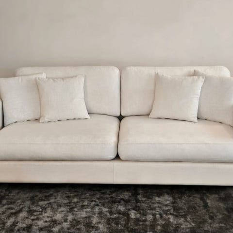 Beige soffa med mkt slitstarkt ”sammetstyg”