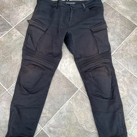 Yttermaterial i äkta läder med foder. Byxorna är i storlek L och har flera fickor samt förstärkta partier. Avsedda som motorcykelbyxor med justerbara remmar nedtill vid bensluten.