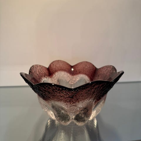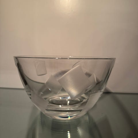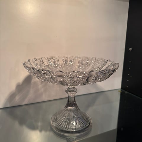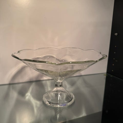 Glas skål på fot i klart glas med slipad dekor runt om. Skålen är cirka 12 cm hög och har en diameter på cirka 14 cm upptill. Passar exempelvis för servering av frukt, godis eller dessert.